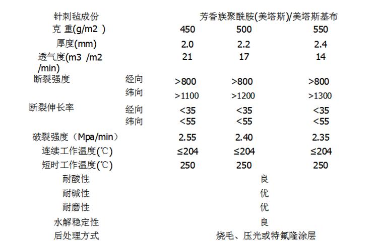 注: 1 、美塔斯耐高溫針刺過濾氈性能測試表見附表